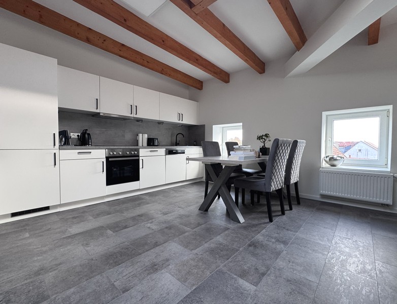 – offene Wohnküche mit Einbauküche inkl. Geschirrspüler, Herd mit Cerankochfeld, Kühl-Gefrierkombination