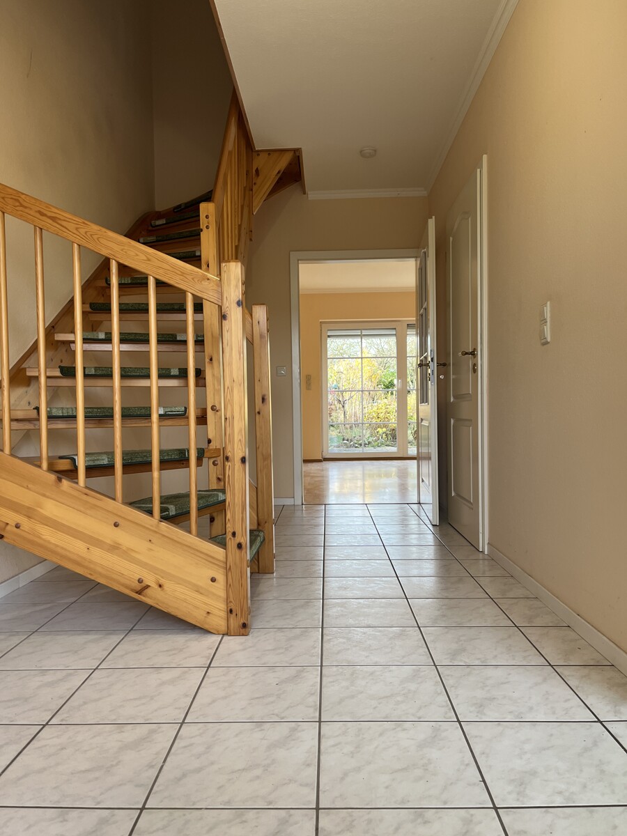 Das Erdgeschoss verfügt über eine Wohnküche, die sich ideal als Zentrum des täglichen Lebens anbietet. Von dort aus erreicht man den Hauswirtschaftsraum, der praktischen Stauraum und Arbeitsflächen bietet und damit die Haushaltsführung erleichtert. Das Gäste-WC mit Dusche im Erdgeschoss ergänzt das Sanitärkonzept sinnvoll für Besucher und den täglichen Komfort. Das Wohnzimmer überzeugt durch einen gepflegten Parkettboden, der eine warme, wohnliche Atmosphäre schafft. Von dort aus erreichen Sie die Terrasse, welche zu gemütlichen Stunden im Freien einlädt und den Wohnraum im Sommer um einen idyllischen Außenbereich erweitert.